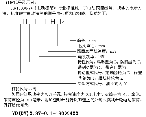 (2).用戶訂購逆止電動滾筒時,須注明旋轉(zhuǎn)方向,如不注明則為任意方向。其表示方法為在特性代號后加“S”(表示在電機引出線一側(cè)觀察,端蓋應(yīng)順時針旋轉(zhuǎn))或“N”(表示在電機引出線一側(cè)觀察,端蓋應(yīng)逆時針旋轉(zhuǎn))。